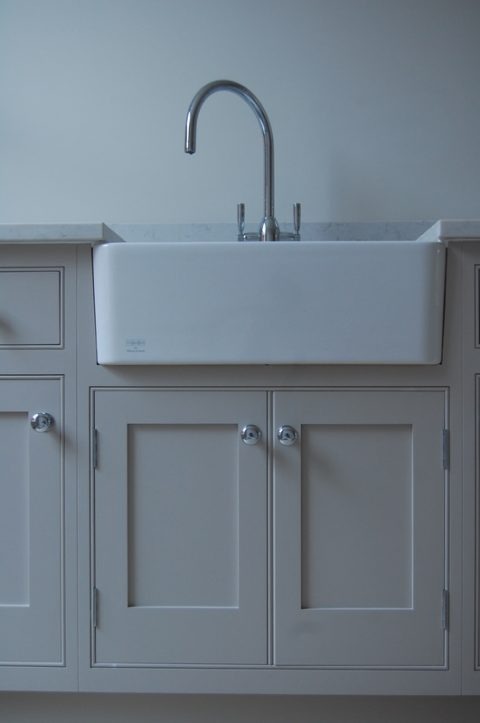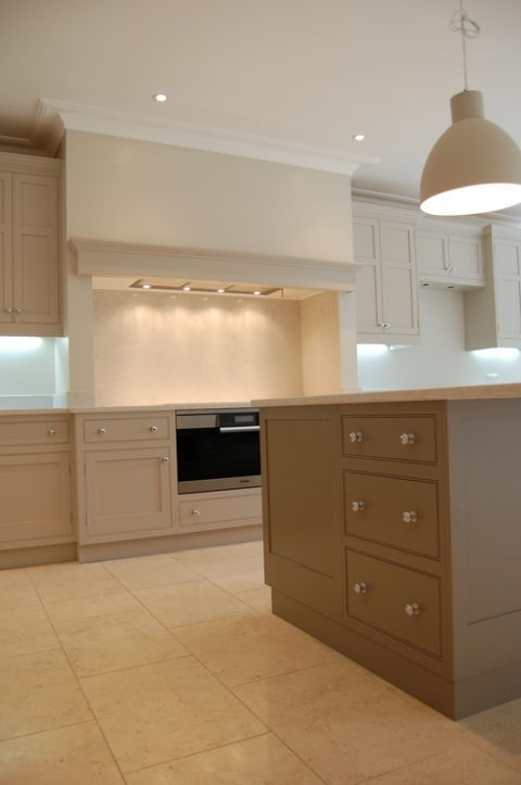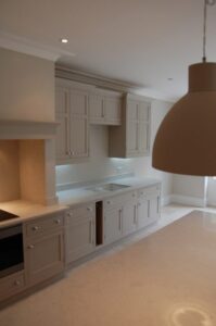 This large kitchen was primed and painted with Farrow and Ball Estate Eggshell paint (colour – Pointing). The primer/undercoat and first coat of paint are completed before the granite worktop is fitted. We always finish the work by brush to attain the smoothest possible finish. (Kitchen by Grants of Sevenoaks)